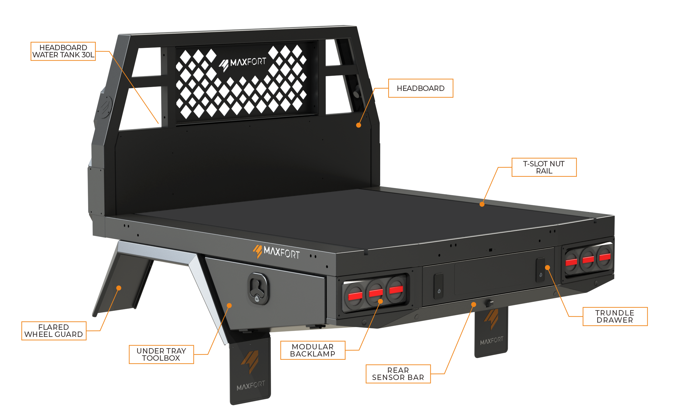 The MAXFORT 600 mini canopy bundle provides a 600mm long canopy for internal storage and an 1800 tray that provides 600mm of open carrying space in the back. Both powder coated in either a matt or gloss finish.